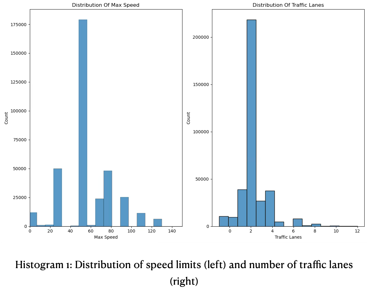 The maximum allowed speed (loca_max_speed) has a moderate positive correlation with the amount of lanes of a road (loca_lanes) of 0.29 and road width of (0.31), suggesting the speed limit increases when more road lanes exist and roads are wider.