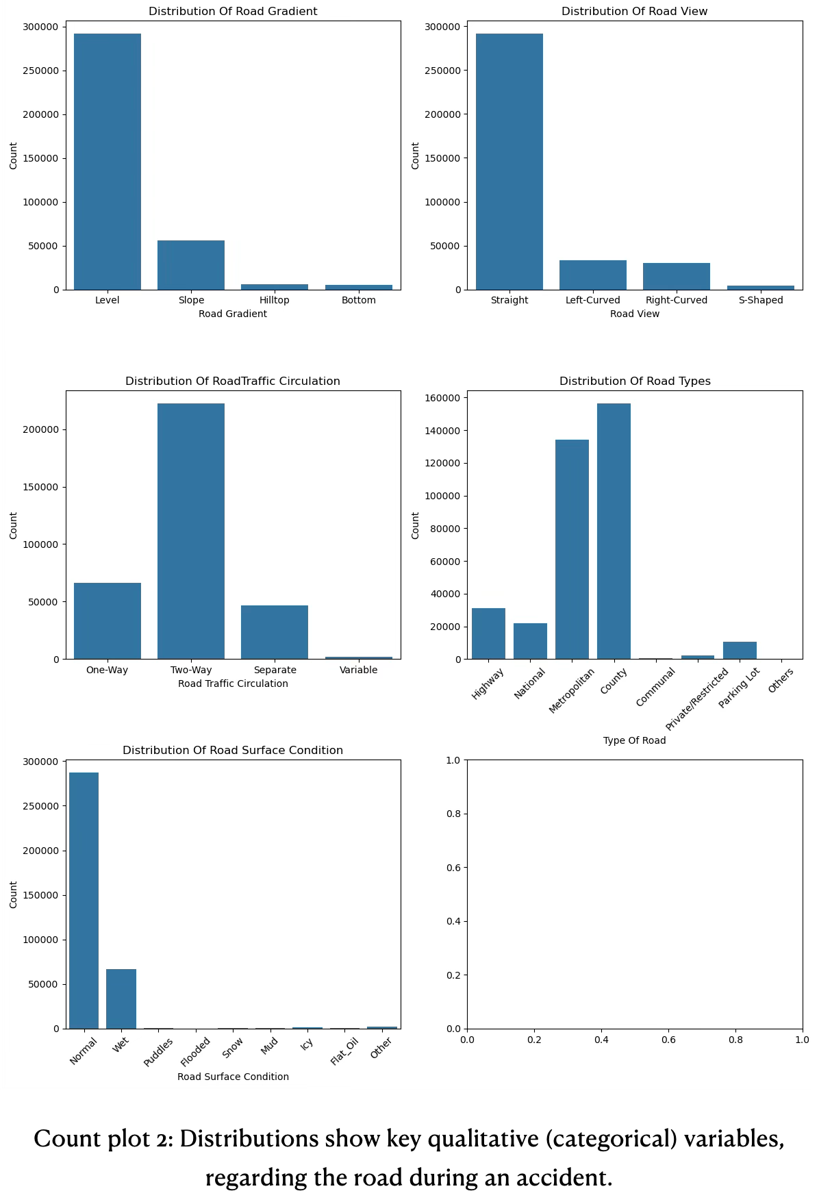 - Most accidents happen on metropolitan and county roads with even straight views on 2-way roads when the road has normal surface condition (dry weather). Significantly less accidents when the road is slope or on a hill top or down at the valley. Also significantly less accidents happen when the road is curved or s-shaped. Accidents on 1-ways or separate lanes happen 4x less often than on 2-way roads. Accidents on highways and national roads where the speed limit is higher has significantly less accidents than metropolitan and county roads with stricter speed limits. These insights are found in count plot 2 below.