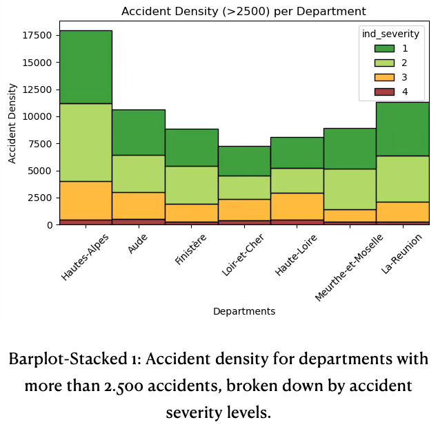 - Most accidents result in minor injuries or none across all departments. Fatal accidents are numerically the lowest but present in every department. Accident density and its severity composition vary among departments, with Hautes-Alpes standing out for both total and severe cases, see stacked barplot 1. La Réunion and Aude also have substantial accident densities, dominated with less severe cases. Departments like Finistère, Loir-et-Cher, Haute-Loire, Meurthe-et-Moselle have lower accident densities overall, but the share of hospitalized and fatal accidents remains relevant and proportional.