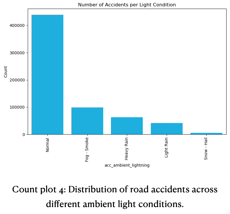 - Light conditions are a critical factor in accident rates and may influence road safety. A significant amount of accidents happen during broad daylight. This reflects most driving — and therefore most exposure during rush hour — occurs during daytime, when traffic volume and visibility is greatest. The substantial drop from daylight to night conditions highlights that fewer accidents occur at night, likely due to reduced traffic volume. See below count plot 4 for information.