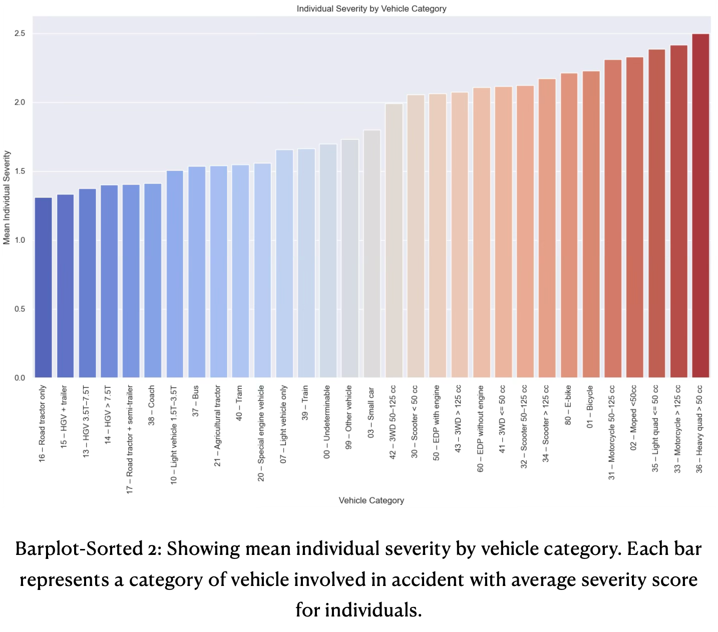 - Average accident severity is much higher for individuals of two-wheeled and light vehicles, than for heavy vehicles, such as buses and tracks, see the sorted barplot 2 below. The analysis provides a clear ranking of vehicle categories by risk.