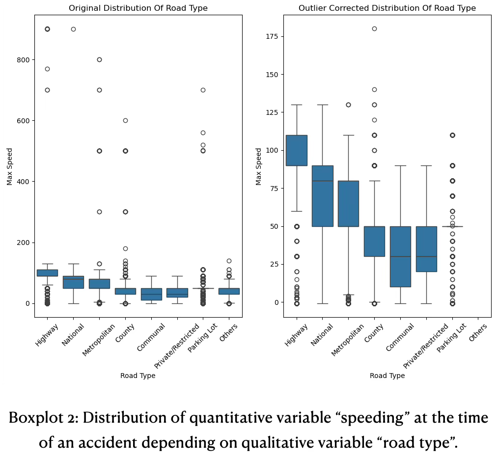 The number of road lanes had erroneous values, such as ‘#ERREUR’ and ‘#VALEURMULTI’. Strategy was to set those values to NaN (missing value). 630 non-breaking space characters \xa0 had to be handled in different columns and could not be fixed via encoding strategies while loading the data from CSV files.