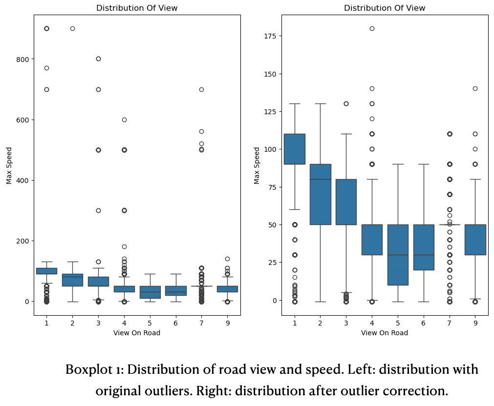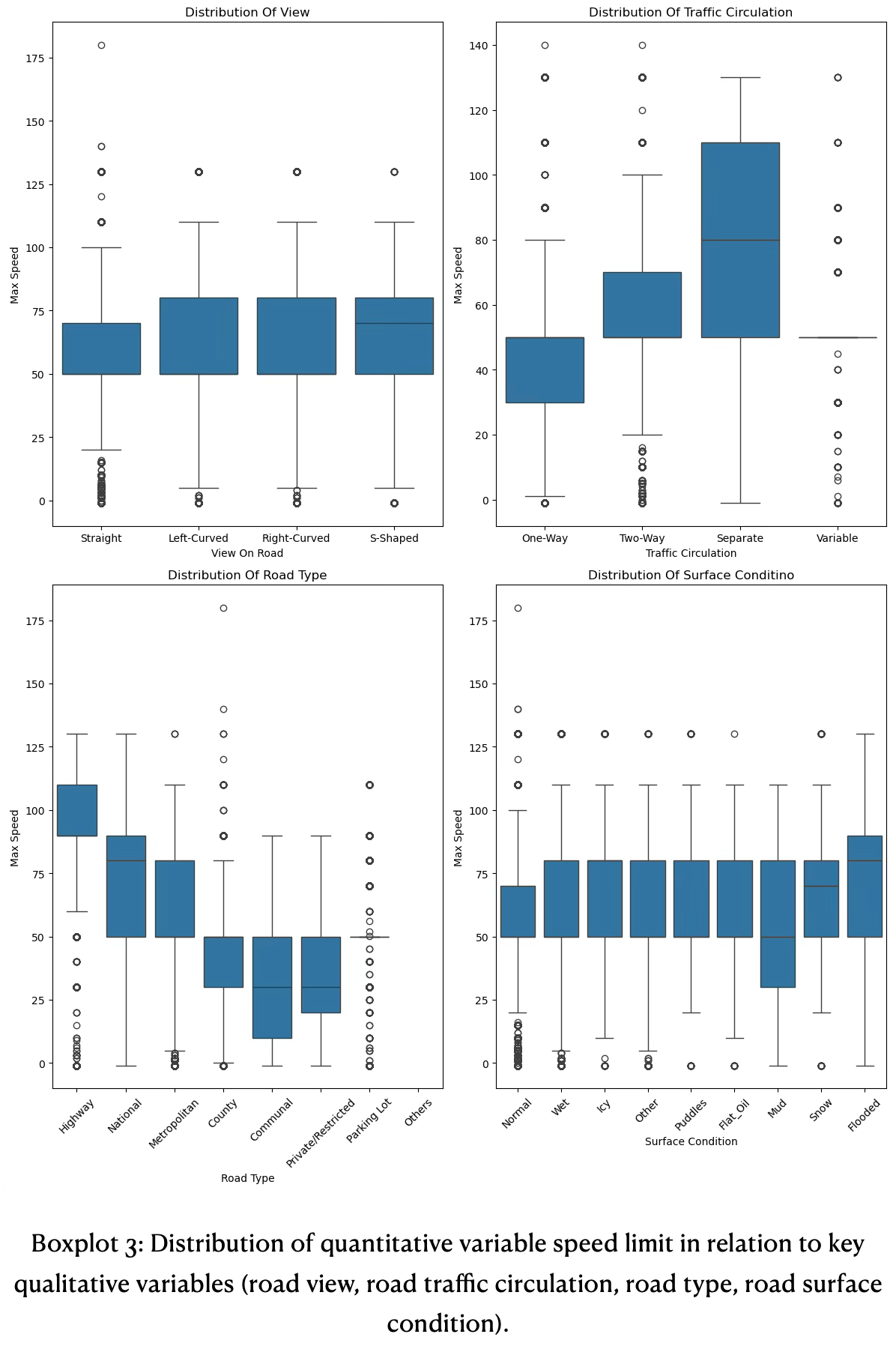 The road view shown in boxplot 3 has pretty similar IQR spreads and almost identical maximum whiskers, suggesting the speed is always similar to the road view with minimum of 50 and maximum speed of round 80.