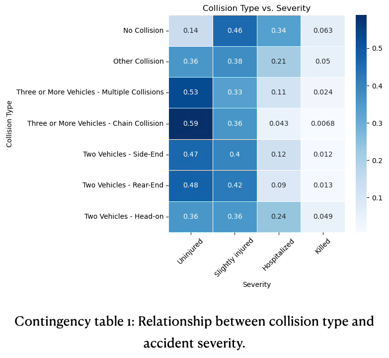 Accidents with no collision have highest proportion for slight injury (0.46). Insights are found in contingency table 1.