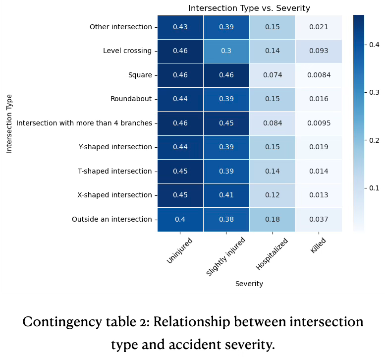 Most intersection-related accidents are minor. Specific locations carry greater risk for severe or fatal outcomes, see contingency table 2.