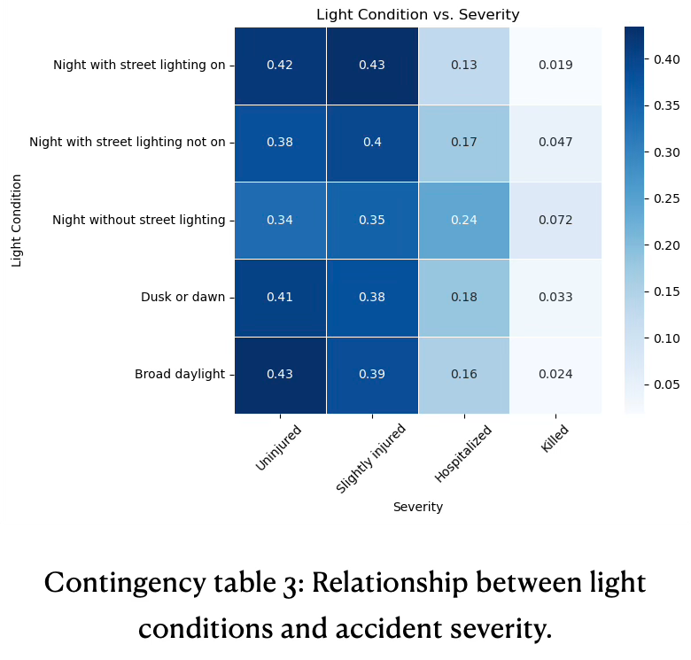 Good lighting conditions are associated with fewer severe and fatal outcomes. Lack of street lighting at night sharply increases the risk of both hospitalization and death, see contingency table 3.