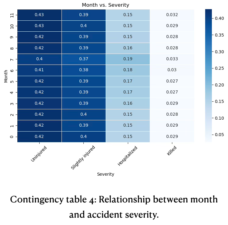 Over the months the occurrence of uninjured, slightly injured, hospitalized, and fatal outcomes is quite stable, see contingency table 4.