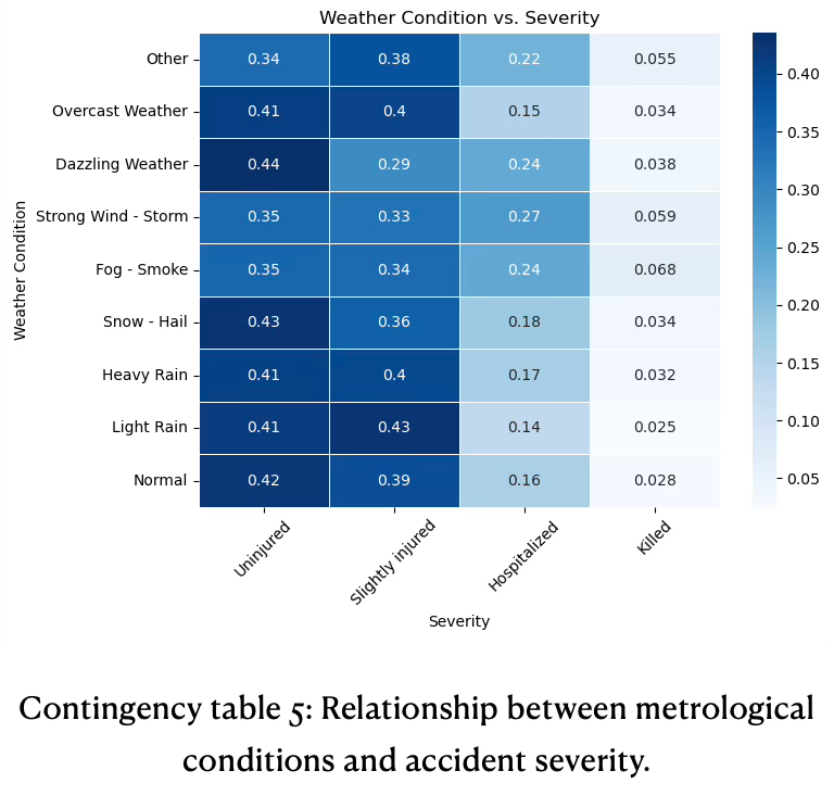 Most accidents, irrespective of weather, result in no injury or minor injuries. Adverse weather conditions (especially fog, storms, dazzling weather) substantially increase the likelihood of hospitalization or death, see for information contingency table 5.