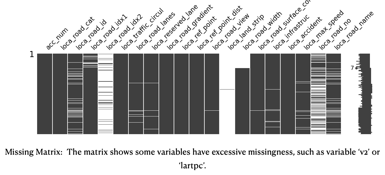 Missing values appear to be variable-specific and not record-specific. Some variables have significant missingness of more than 90%, such as reason for trip during accident, an alphanumeric index of the road, the size of the land strip running along the center of the road, the number of people in public transportation. Common causes could include structural missingness (variables are not applicable) and data collection & reporting issues (human error, optional items or questions, respondents refuse to answer questions).