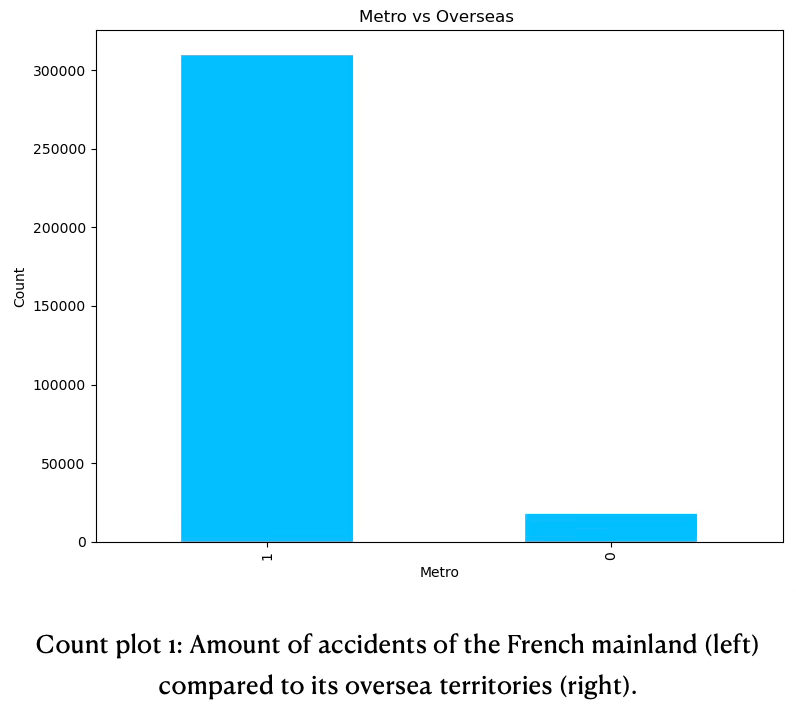 The dataset not only includes accidents of the French mainland, but also its oversea territories. Since the amount of data in the overseas territories is rather small compared to the mainland (see count plot 1 below), it was excluded from further investigation and model training.